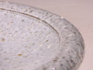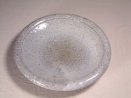 | 粗土にわら灰釉をかけ、手にズシッと重い器です。 口縁を外に垂らした器のバリエーションのひとつです。 見込みがなだらかなラインなので鉢というより皿の範疇でしょう。 白っぽい色をしていますが、ブルーもわずかに入っています。 砂のような粗い部分も良く見ると、不透明の白や半透明なものなどがあるのが分かります。 |
