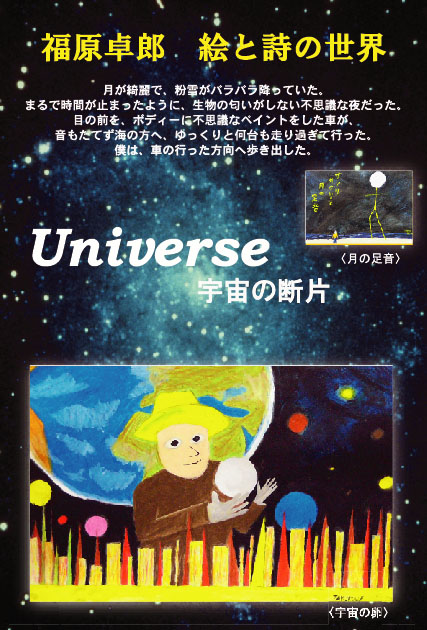 | 福原卓郎さんの絵と詩を絵はがきにしました。 背景の宇宙は、既存の写真を使用しています。 福原さんと相談しながら構成したものです。 原画は個展会場でご覧いただきたいと思います。 |