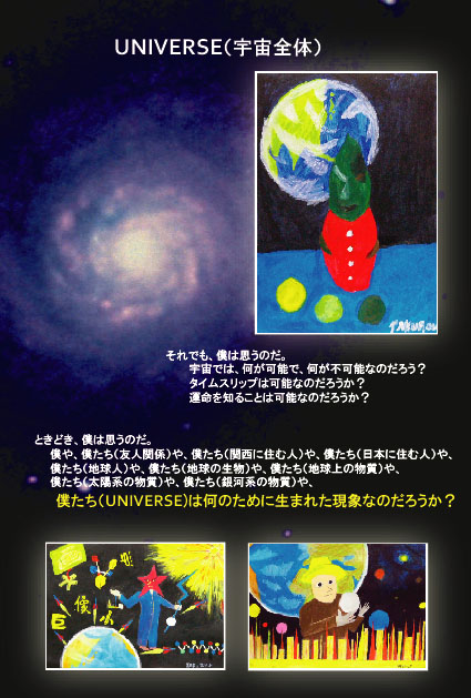 UNIVERSE 01 UNIVERSE(宇宙全体) 詩 「ユニバースとマルチバース」より 絵 「考える人」 「宇宙の卵」 「捜索」 |